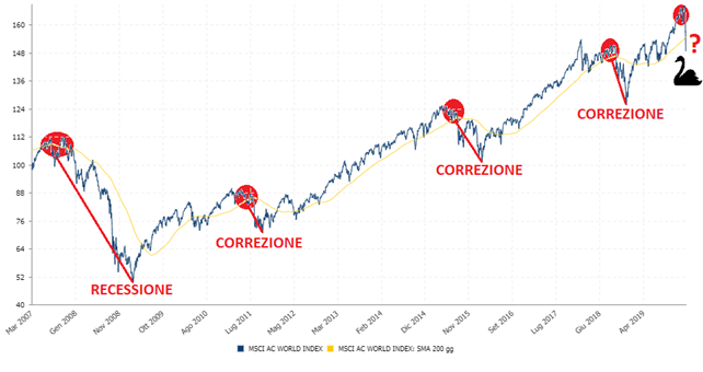Un detto popolare dice che non c’è due senza tre… ma se vi sono già state tre importanti correzioni - seguite da riprese quasi a V - dal 2009 ad oggi, potrebbe invece essere che la quarta diventi qualcos’altro e si trasformarsi in una recessione causata da un cigno nero dagli occhi apparentemente a mandorla.
