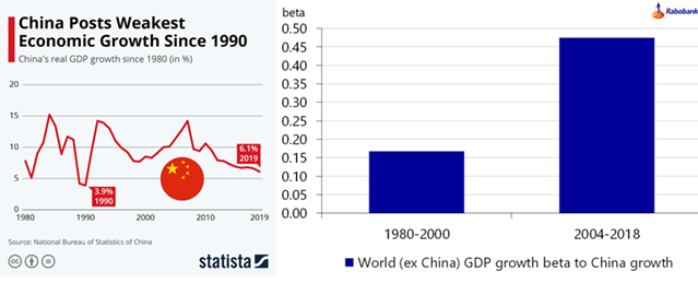 Di fatto e secondo un report di Rabobank dal titolo “Outbreak of uncertainty”, la sensibilità dell'economia mondiale al tasso di crescita del PIL cinese è stato dello 0,17 tra gli anni '80 ed il 2000 mentre ha quasi triplicato, fino a 0,47, negli ultimi 15 anni.