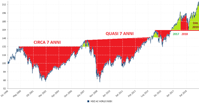 A tal proposito basti ricordare che i listini azionari mondiali (dividendi esclusi - così da analizzare il solo andamento dei prezzi azionari) dai massimi della bolla “dot.com” di inizio 1999/2000 richiesero circa 7 anni per rivedere le medesime quotazioni e dopo la crisi più recente dei mutui subprime del 2007/2008, dovettero trascorrere altrettanti anni per riagguantare quei valori massimi, ovvero quasi 3 lustri per rivedere gli stessi prezzi.