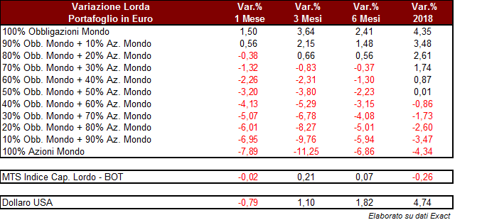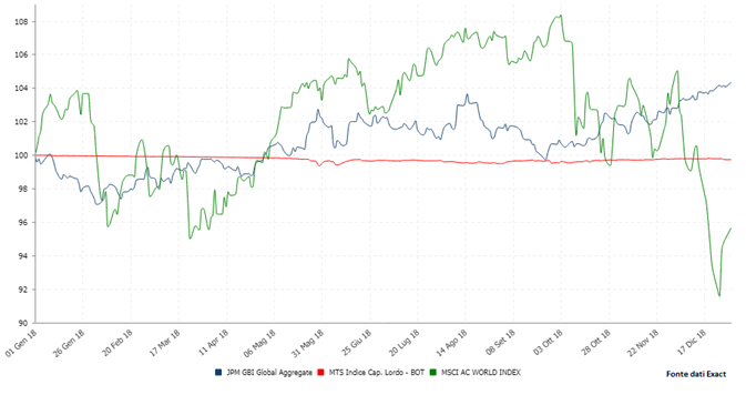 Dal grafico emerge evidentemente che il range di rendimento in cui si dovrebbe trovare il proprio portafoglio a fine 2018 e sempre se si è rispettato un principio di diversificazione globale senza applicare coperture valutarie e senza fare scommesse specifiche, sarebbe compreso tra un massimo del +4,3% (obbligazioni mondiali) ed un -4,3% (azioni mondiali), passando per qualche decimo di punto negativo -0,26%, se il tutto fosse stato investito nello strumento più conosciuto dai risparmiatori, ossia il BOT.