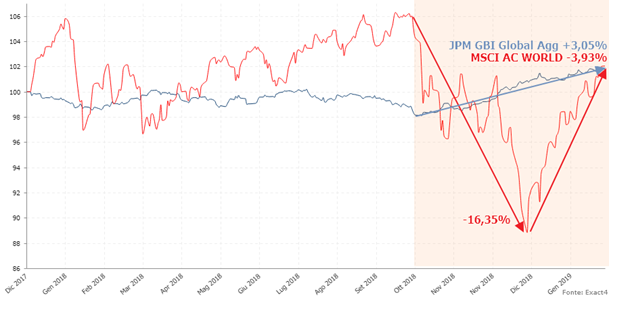 Da fine settembre ad oggi, le borse mondiali in valuta locale hanno recuperato buona parte delle quotazioni e dopo una discesa di oltre il -16% si è quindi tornati ad un più “accettabile” -4% dai massimi. Nel durante di questo eclatante giro di montagne russe si è pure alimentato - per l’ovvia paura - un rialzo nei prezzi delle obbligazioni mondiali a seguito dello spostamento di masse avvenute dal travaso degli asset azionari verso asset considerati meno volatili come le obbligazioni e che di fatto hanno visto un forte aumento dei prezzi ed un +3% di rialzo da ottobre.
