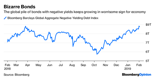 Il mercato obbligazionario grazie alla fuga innescato dai ribassi azionari di fine anno è ritornato ad esprimere obbligazioni a rendimenti negativi per un circolante prossimo ai 9 trilioni di dollari, ossia è ritornato con forza al bizzarro mondo del presto soldi per averne meno a scadenza e senza interessi.